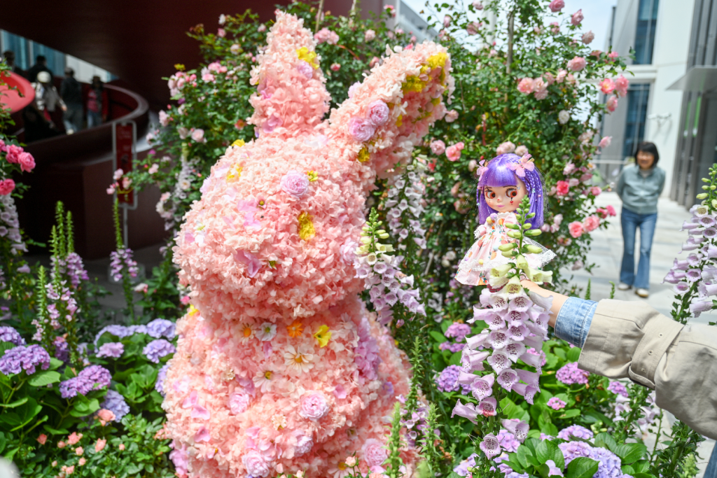 4月18日,上海前滩公园巷,游客拿着玩偶和花丛中的“兔子”装置合影。澎湃新闻记者 朱伟辉 图