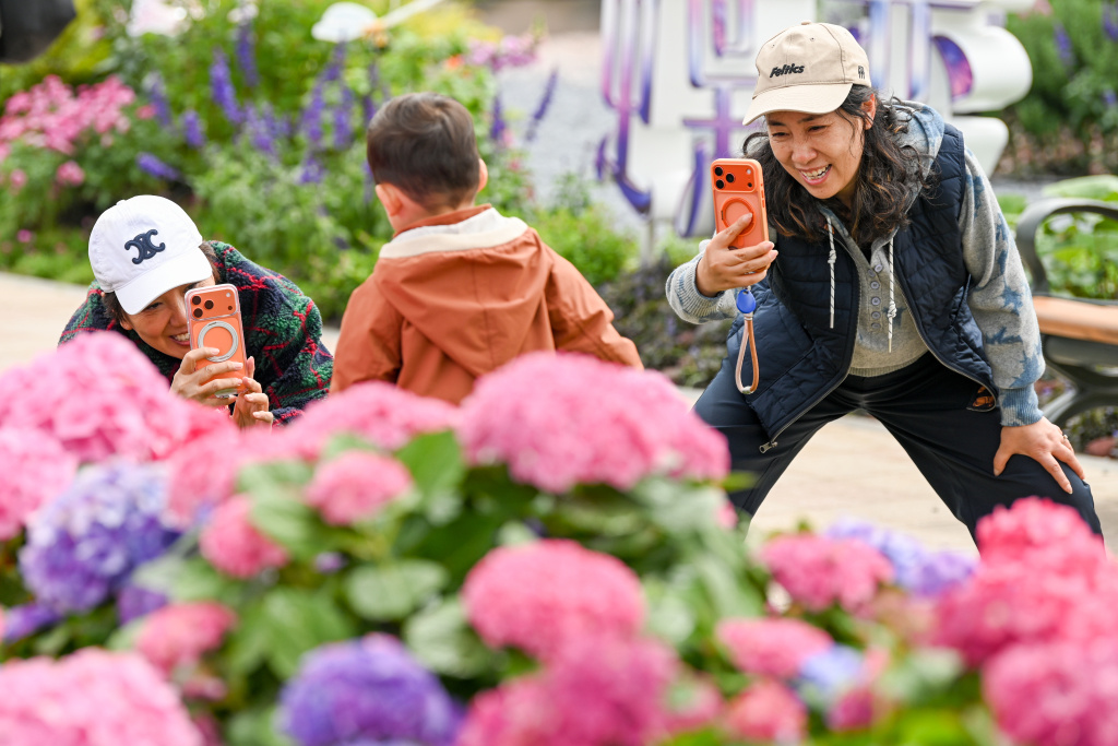 4月18日,上海,前滩休闲公园,两位女性给绣球花前的小男孩拍照。澎湃新闻记者 朱伟辉 图