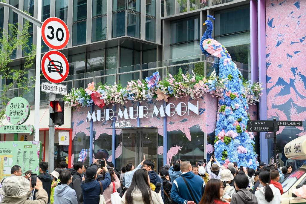4月18日,上海前滩公园巷,商店门头上的孔雀装置吸引众多市民游客拍照。澎湃新闻记者 朱伟辉 图