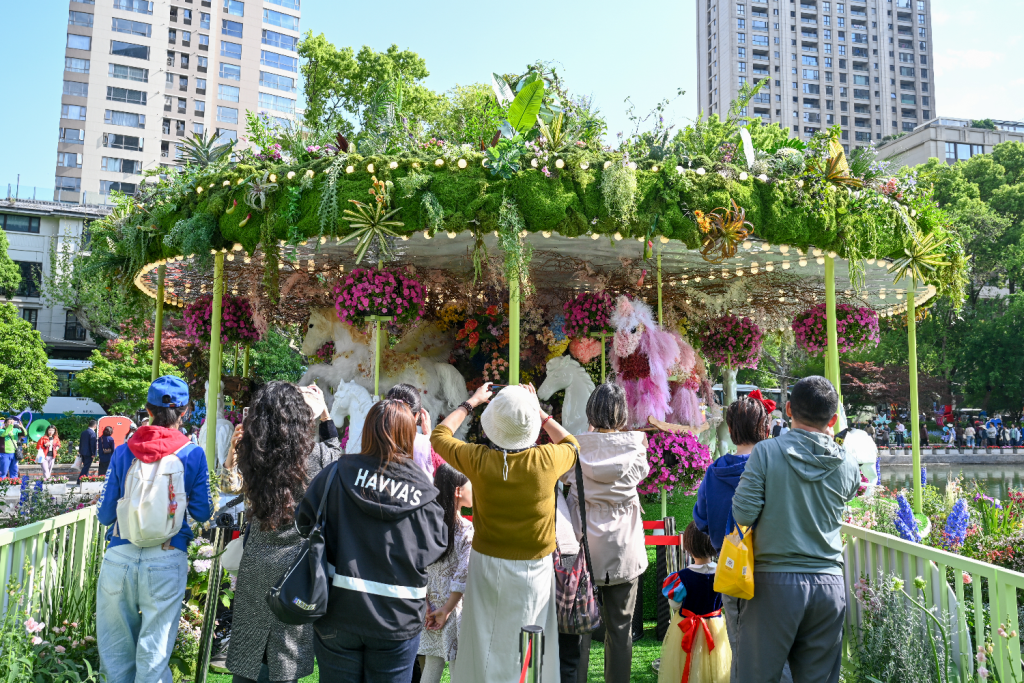 今年的花卉节不仅在花艺布置上别出心裁,更有多处打卡点在开幕前便已在网络率先出圈。静安苏河湾展区的一组“潦草小狗”花艺雕塑,以其憨态可掬、略带随性的造型迅速俘获年轻人的心;浦东前滩的“动物园”主题花艺装置萌趣横生,成为亲子家庭和拍照爱好者的首选;而黄浦新天地的“旋转木马”花艺作品则凭借梦幻优雅的设计,吸引了大量市民驻足留影……