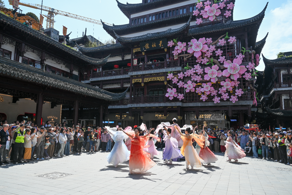 4月18日,上海豫园商城,十二花神群舞吸引众多市民游客。澎湃新闻记者 朱伟辉 图