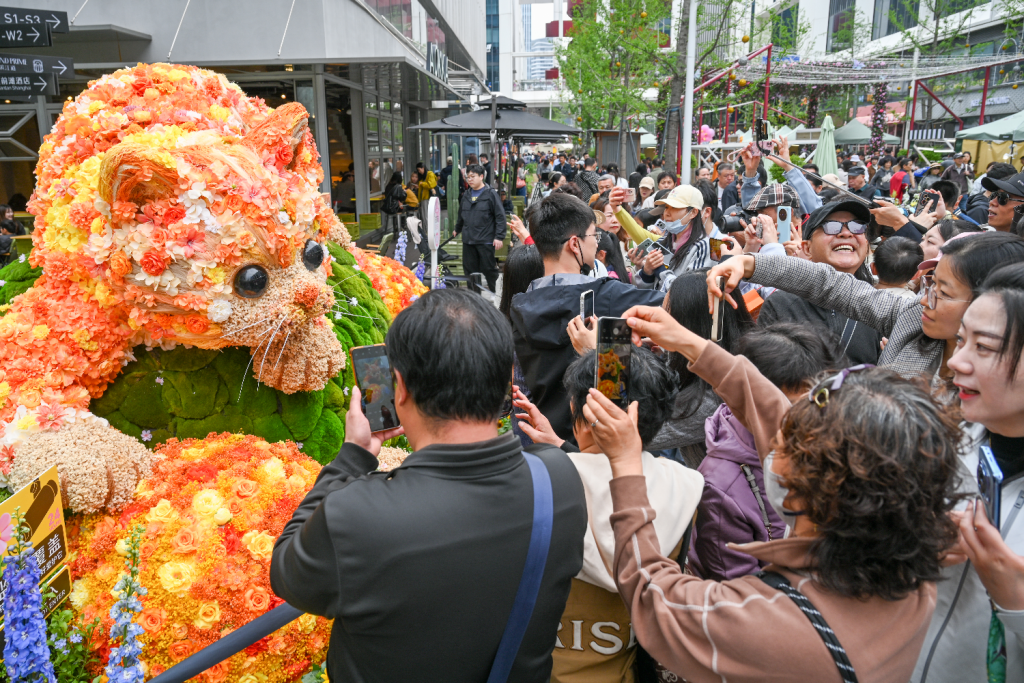 澎湃新闻记者在现场看到,浦东前滩公园巷和前滩休闲公园区域人潮涌动,不少市民扶老携幼前来赏花。花丛间、装置旁,随处可见举着手机或相机拍照的游客。一位带着孩子前来游玩的市民表示:“早就看到网上有人发‘动物园’的照片,今天天气好,专门带孩子过来看看,果然很可爱。”